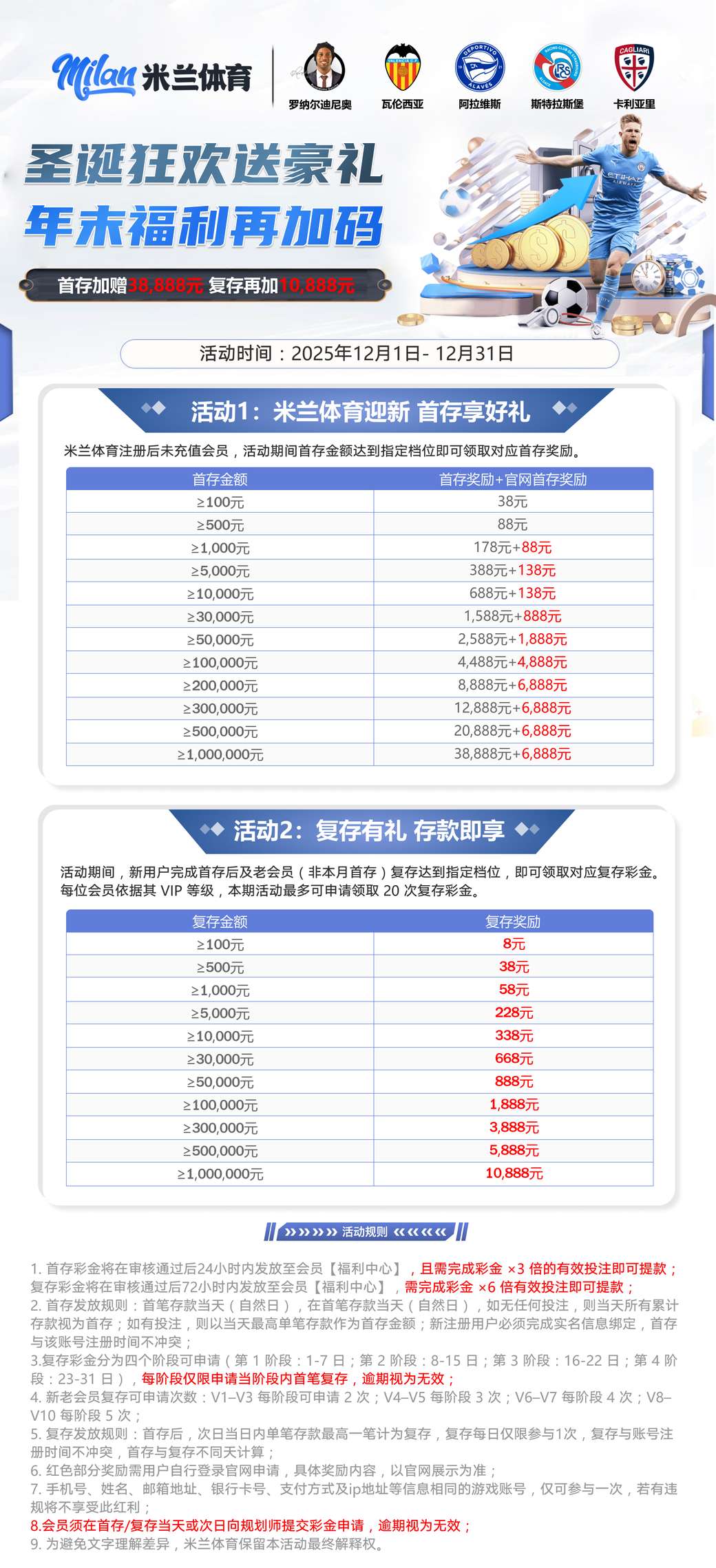 米兰12月首存1000送178+88+88,1倍水,流水满5千加送218。以前注册现在首存也可以。
